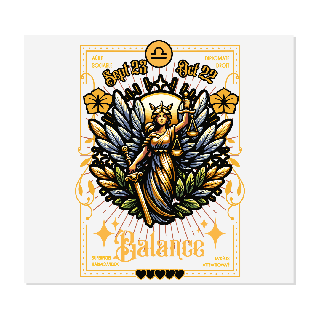 Découvrez notre design prêt à presser DTF "Signe Balance", parfait pour les amateurs d'astrologie et de personnalisation textile. Ce transfert élégant représente la Balance avec des détails raffinés, ajoutant une touche de mysticisme et de style à vos créations. Idéal pour les vêtements et accessoires, il captera l'attention de vos clients passionnés par les signes astrologiques.