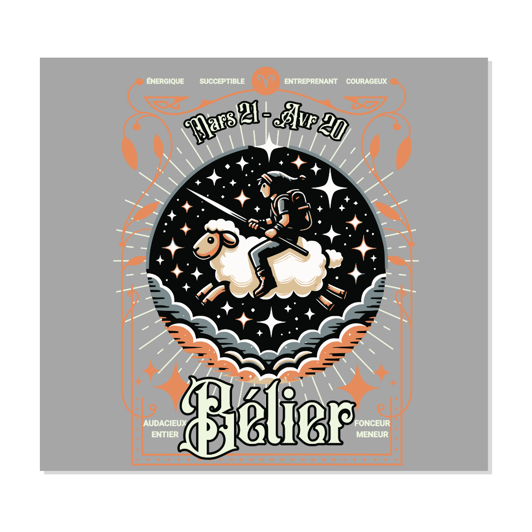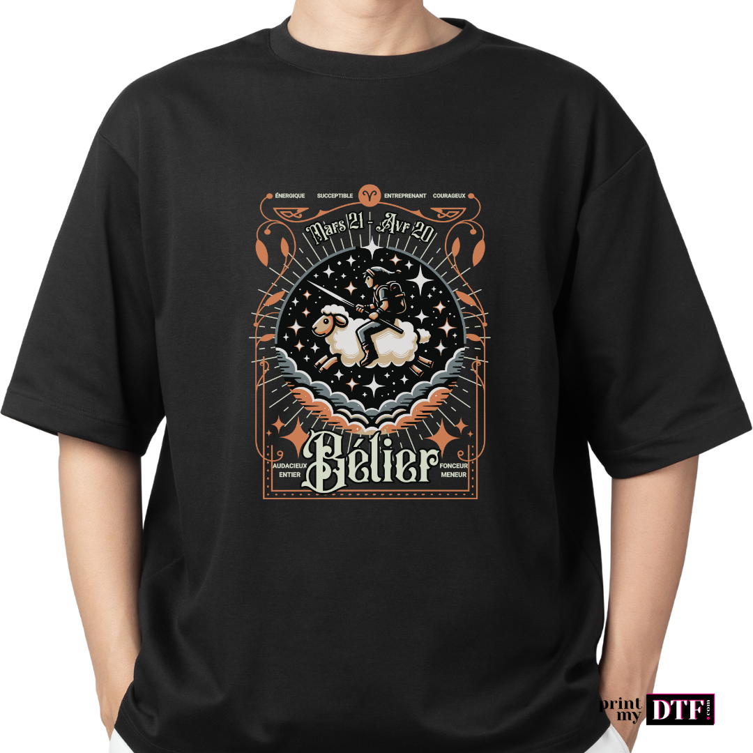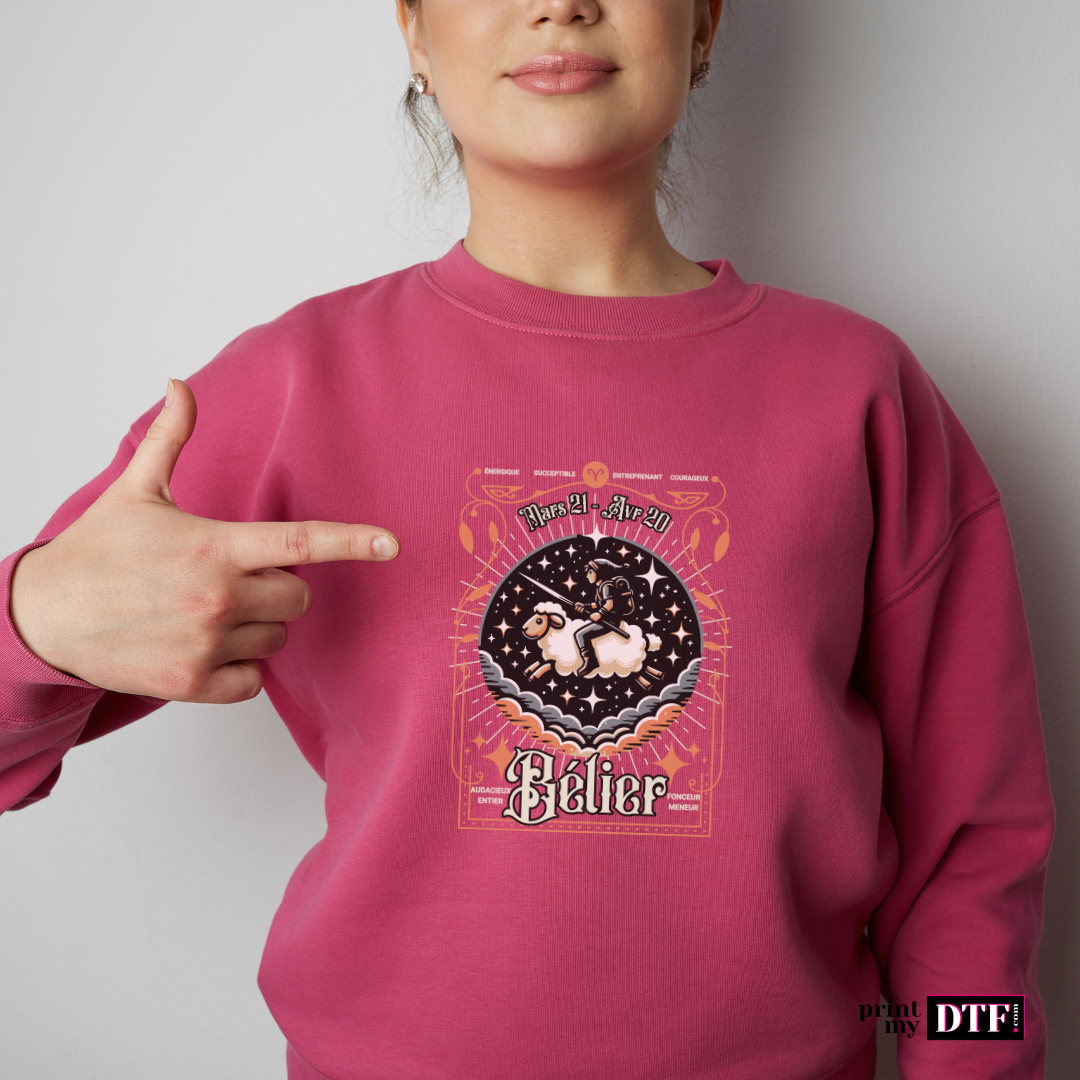 Optez pour notre design prêt à presser DTF représentant le signe astrologique Bélier. Conçu pour les professionnels de la personnalisation textile, ce motif dynamique et audacieux ravira vos clients passionnés d'astrologie. Parfait pour ajouter une touche de caractère à vos créations.
