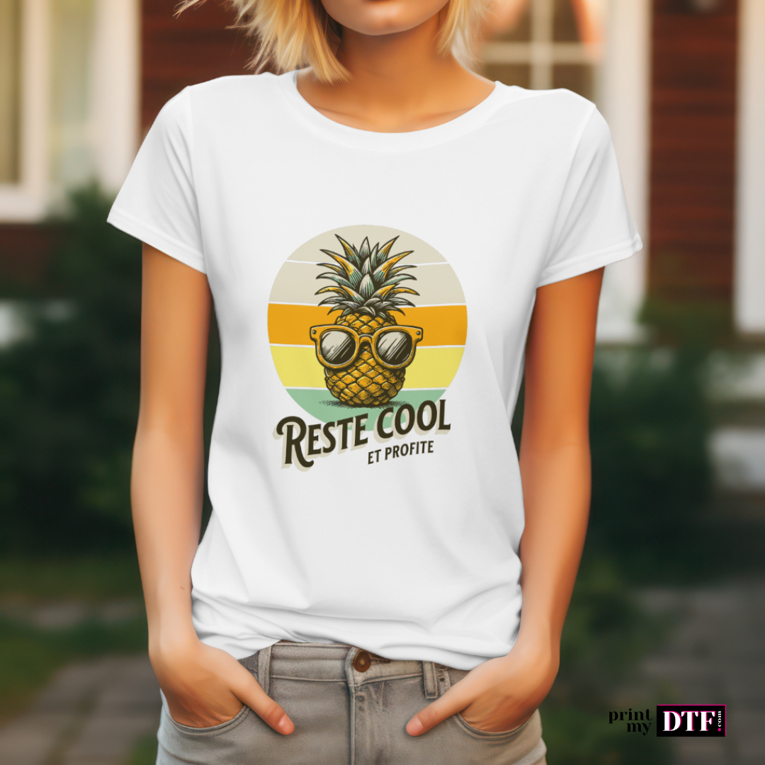 Apportez une touche de décontraction à vos textiles avec notre design de transfert DTF "Reste Cool". Idéal pour des projets de personnalisation, ce transfert prêt à presser combine simplicité d'application et durabilité. Parfait pour transmettre un message de sérénité et de style décontracté.