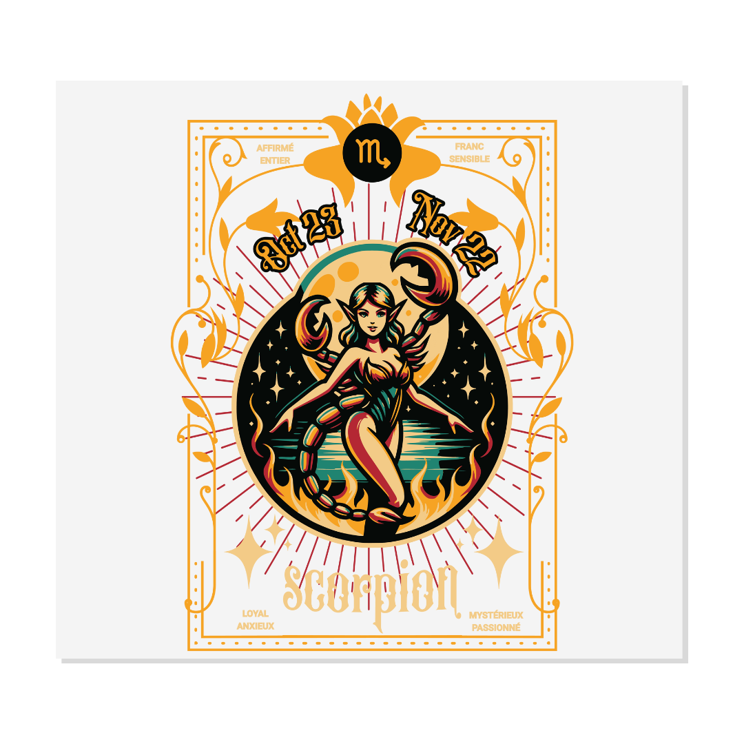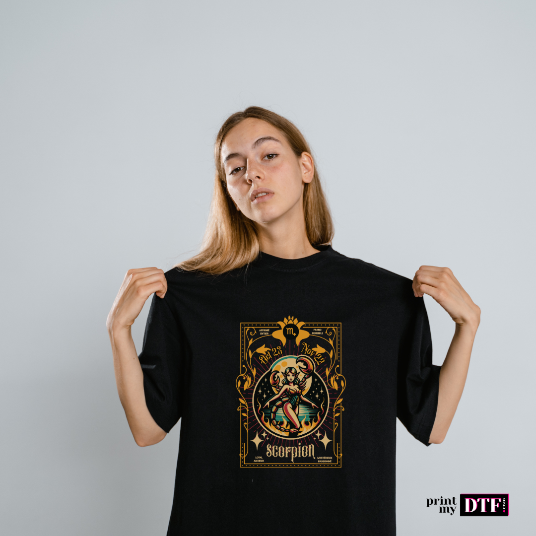 Découvrez notre design prêt à presser DTF représentant le signe astrologique Scorpion. Idéal pour personnaliser vos textiles, ce motif allie élégance et mystère. Parfait pour les professionnels de la personnalisation textile, ce design saura ravir vos clients amateurs d'astrologie.