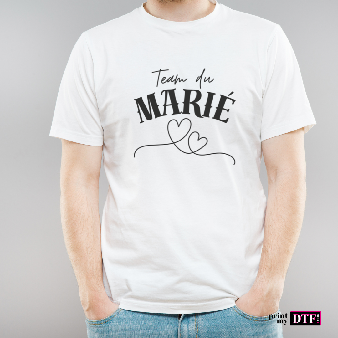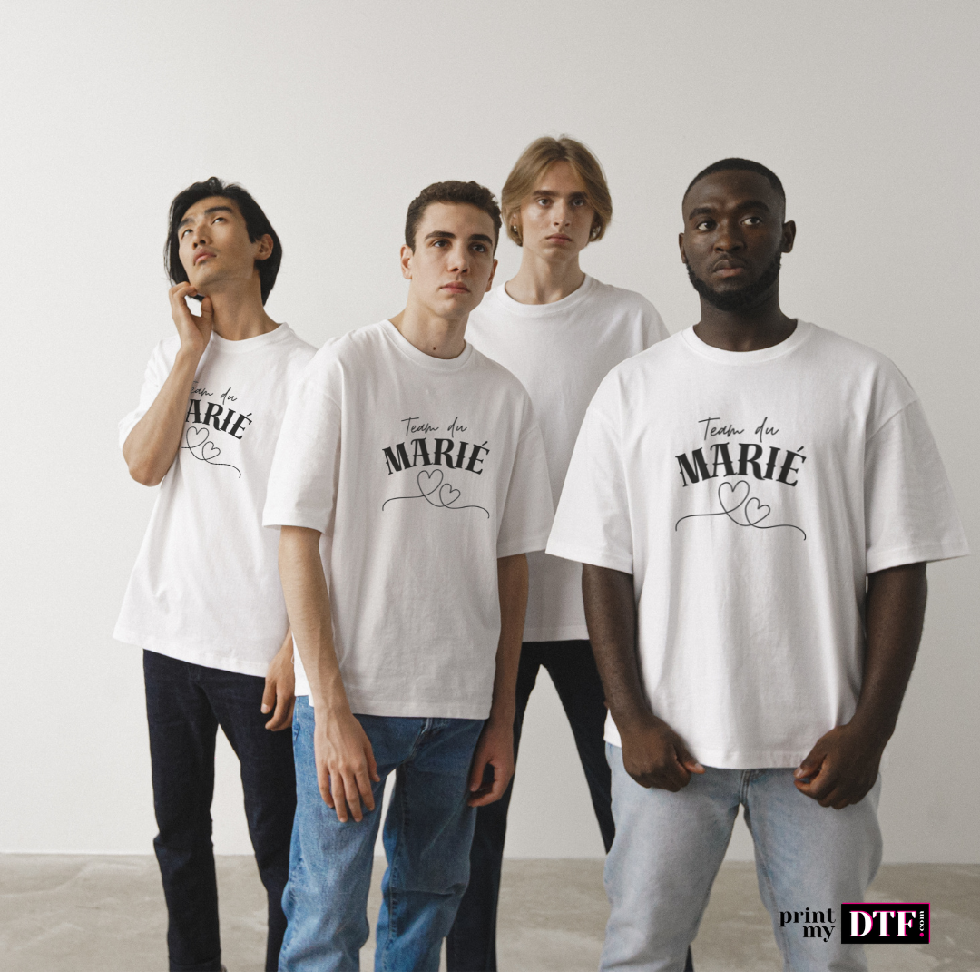 Nos planches de transfert DTF assurent une qualité d'impression supérieure et une durabilité exceptionnelle. Simplifiez vos projets de personnalisation textile en offrant à vos clients des designs amusants et mémorables qui rendent hommage à la Team du Marié.