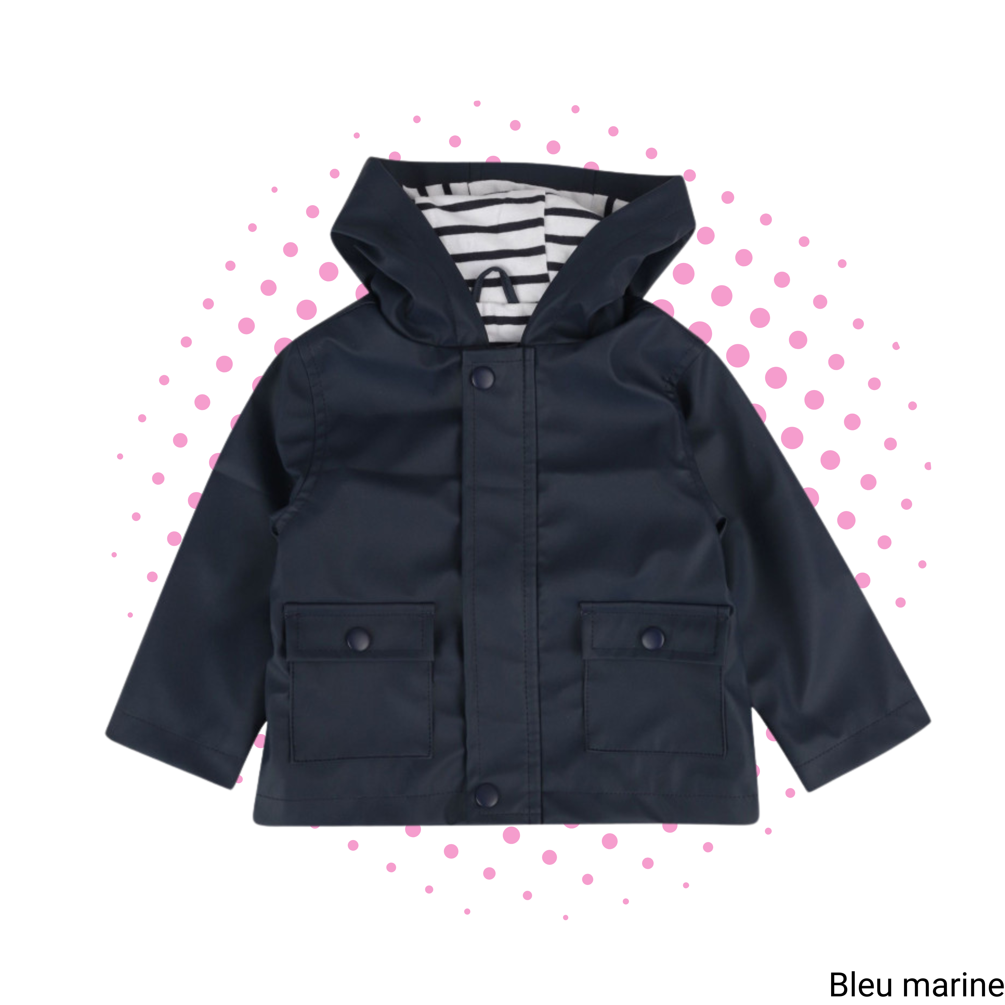 Veste grand zip avec rabat. Intérieur en coton jersey rayé. Poches frontales avec rabat. Déperlant.